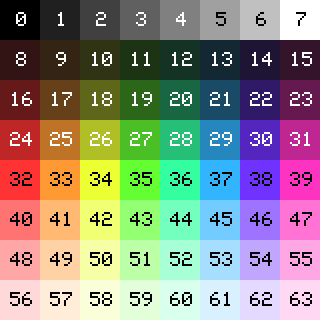 raster.js doesn't think in RGB, instead drawing is done using 8-bit values that correspond to a palette of 64 predefined colors. For example, 37 in the above palette is a sky blue, so by calling ra.setColor(37) this color will be used for the following draw operations.
